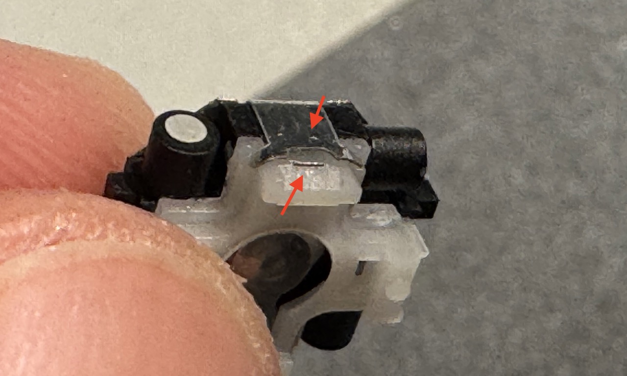To disassemble the EVQWJN007 module, the most effective method is to hold it upside down (with the trackball facing the floor) at an angle. Use a pair of precision tweezers to carefully unclip at least two of the retaining clips around the edges. This allows the top white plastic housing to pop off, exposing the core mechanism: four miniature axes fitted with tiny “teeth” designed to grip the trackball’s surface.