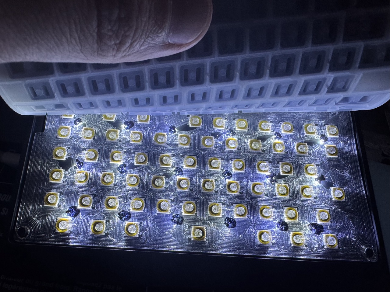 Finally, place the diffuser back onto the keyboard PCB and turn on the LEDs. Dab the marker on any spots where the LED isn’t fully covered or the ink layer is too thin to block the light. Use this opportunity to touch up any areas with excessive light leakage where the light isn’t fully blanced.