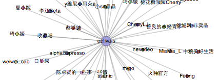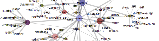 每一个人代表一个节点,我个人位于中间的节点。在这个数据组里面,连接自己的节点数量较多,中心的点weight递加之后,便形成较大的节点。图1有遗漏一些信息,比如节点并不能说明这个粉丝也同时是我的朋友,也许此人是我的粉丝而我们却没有互相关注。图2和图3就可以显示出更近一部的关系。